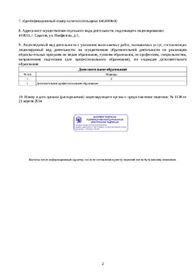Лицензия на образовательную деятельность № Л035-01279-64/00198360 от 21.04.2014.